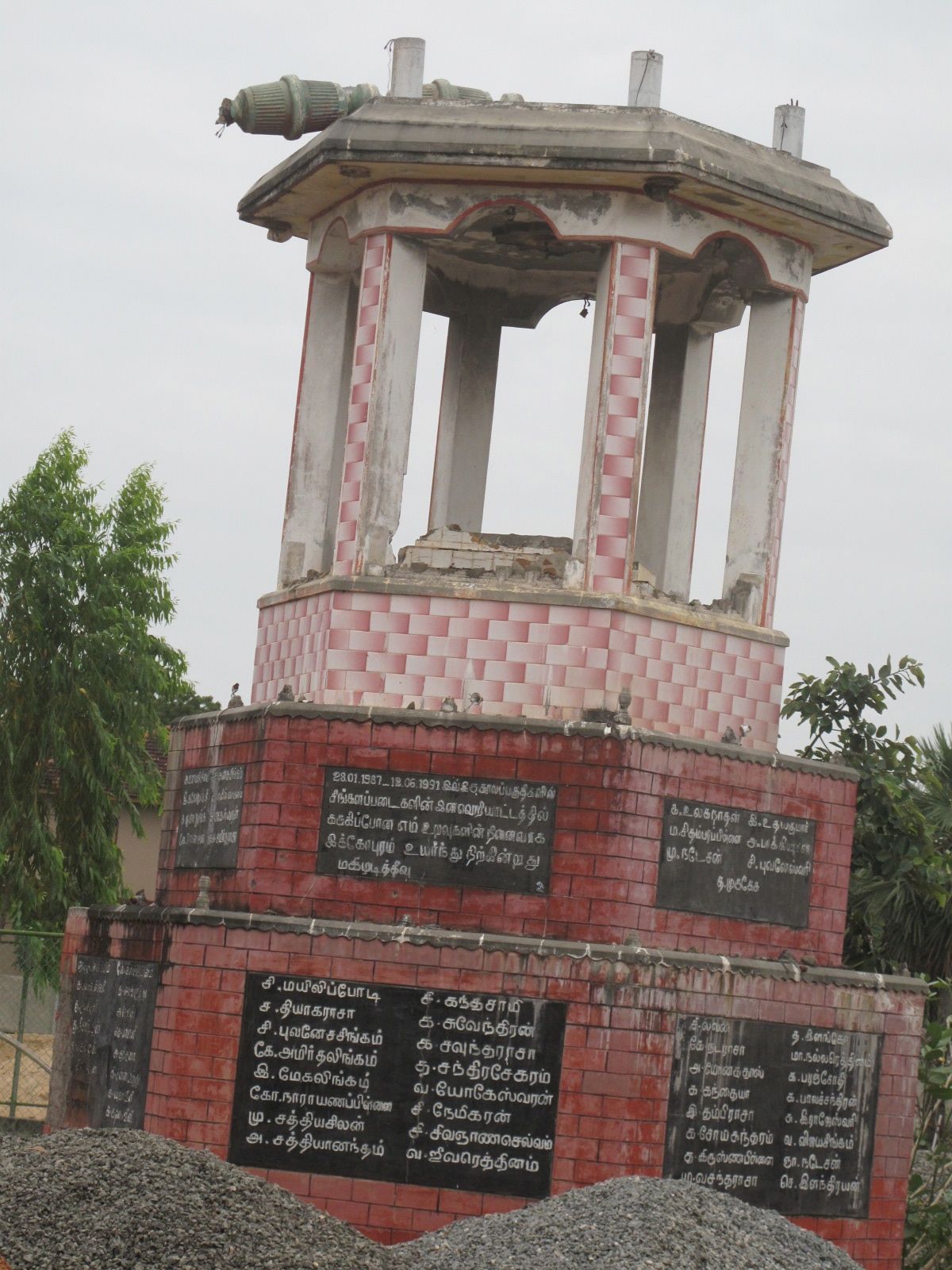 The memorial to the first massacre was constructed by the Mahiladitheevu Village Development Council, under the auspices of the LTTE, and inaugurated on January 29 2003 (during the ceasefire). It was badly damaged during the last stages of the Eastern operation, in 2007, but was subsequently renovated by the pradeshiya sabha (local govt) of that area.