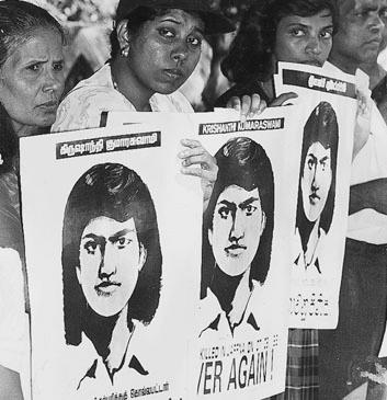 Krishanthi Kumaraswamy was gang raped and killed by six SLA soldiers while returning home after sitting for one of her GCE Advanced Level Examination papers. Her mother, younger brother and a neighbour who went in search of her were also killed and buried, along with Krishanthy, in shallow graves within the Kaithady Army Camp.