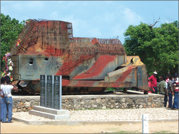 Remains of the LTTE tank (a re-fitted bulldozer) stopped from entering the Elephant Pass army camp by Corporal Gamini Kuleratne, popularly known as ‘Hasalaka Gamini’.